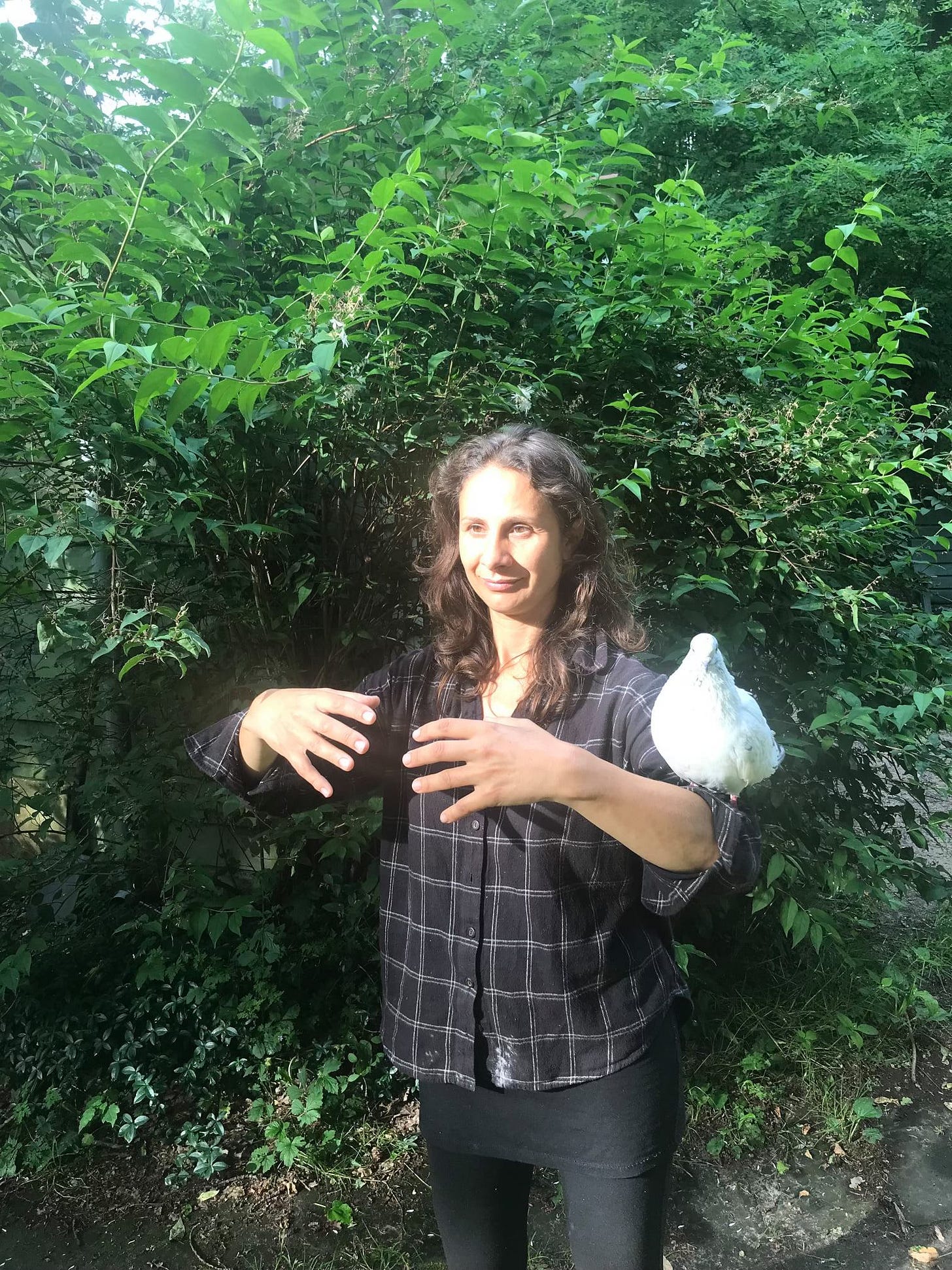 This way, in 2020 I gained a new training companion. A white pigeon that me and my daughter rescued from the animal center. The pigeon grew very fond of us. And he enjoyed perching on my hand or arm while I practiced still standing outside.